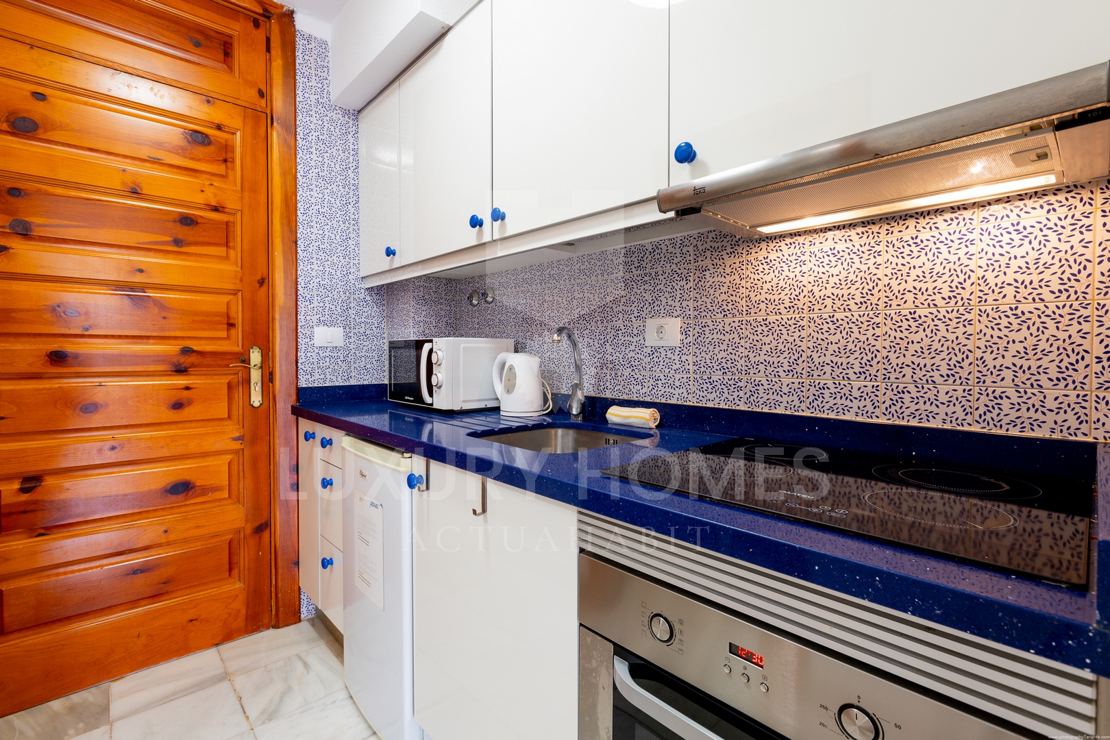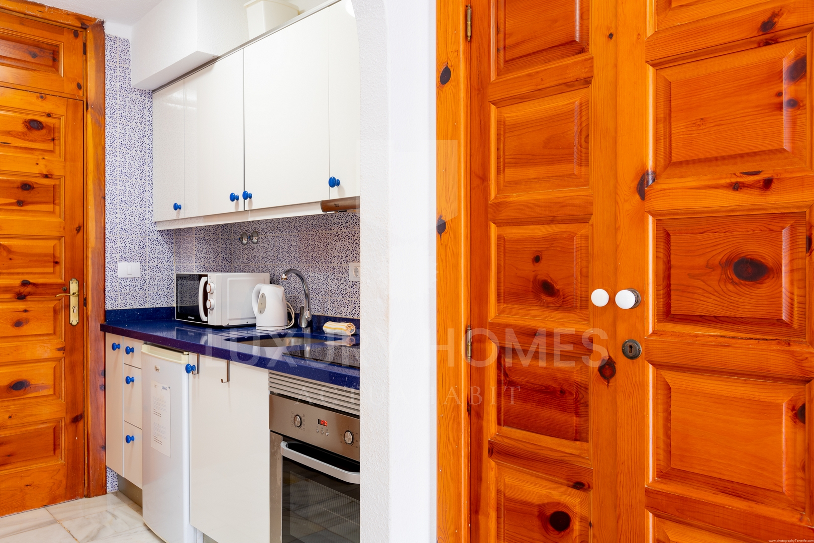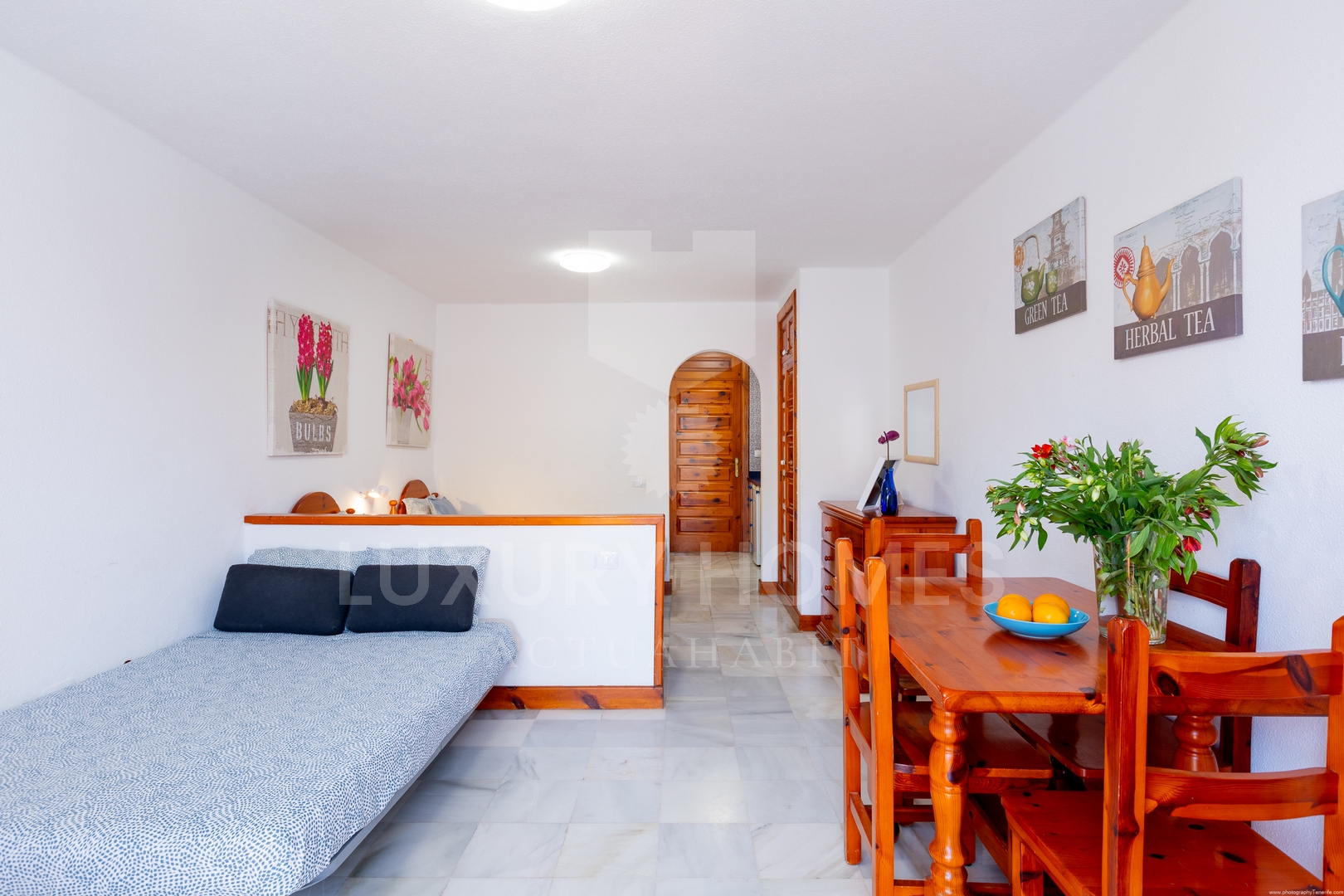 Se vende un estudio en el complejo Parque Santiago III, ubicado en primera línea de mar, en una de las mejores zonas del sur de Tenerife. El espacioso apartamento cuenta con una terraza desde la cual se disfruta de una hermosa vista a la avenida que conduce a la playa y al océano. Se vende amueblado. El complejo está situado en la Milla de Oro, a poca distancia a pie del océano y varios de los mejores playas de Tenerife, Playa El Camisón y Playa Las Vistas, así como diversos comercios, restaurantes, bares y supermercados. El complejo cuenta con piscina al aire libre, centro de fitness. El establecimiento cuenta con recepción 24 horas, restaurante familiar, parque acuático y solárium. Ofrece bañera de hidromasaje. Es el lugar ideal para unas vacaciones relajantes. Comunidad 473 euros por trimestre (agua incluida).
